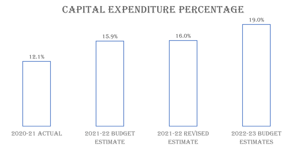 The two components of the government expenditure are the revenue expenditure and capital expenditure. Capital expenditure by the government goes into the creation and maintenance of assets like schools, colleges, hospitals, roads, bridges, dams, railway lines, airports and seaports. This time the government announced PM Gati Shakti focusing on the capital formation in the infrastructure development. There has been a significant increase in the share of capital expenditure since last budget. The government has continued in the same direction this year with the budgetary allocation share of capital expenditure is as high as 19% in FY 22-23 Budgetary estimates.