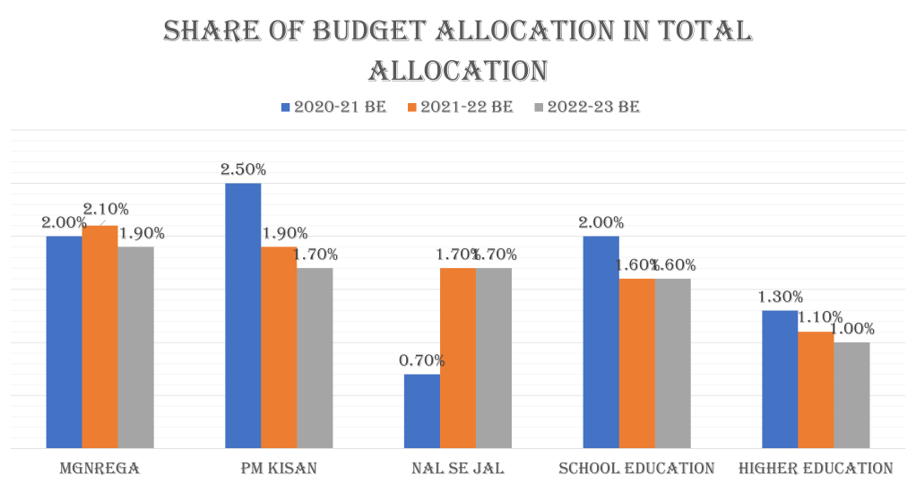This is one sector that has got severely impacted during the pandemic years. There has been a size able section of students from both rural and urban who dropped from school or missed the education for two consecutive years because they were not able to attend in the virtual mode. The mid day meal scheme was devised to bring people to education system. With the virtual mode that program also did not work making the things more worse. So this year becomes important as things becoming normal it is important to focus more on this sector. But there was no significant increase in the allocation in this sector. There was a 12% increase in the education budget this year. But the share of education in total allocation actually declined to 2.6% from 3.3% in FY 2020-21 Budget estimates. The same trend is visible both for school education and higher education.