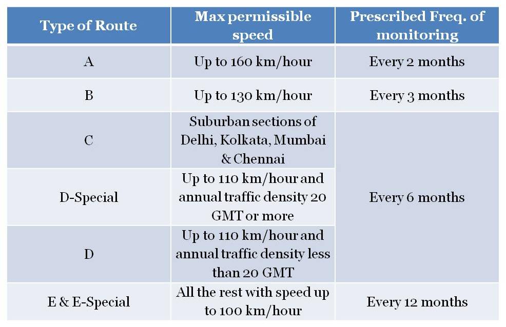 The permanent way staff responsible for track maintenance carries out regular periodic inspections to assess the health of the tracks: structurally and geometrically. The CAG Audit report classifies broad gauge lines into 6 groups basis maximum permissible speed. The target frequency of monitoring for each group as prescribed by Indian Railways is also given in the below table: