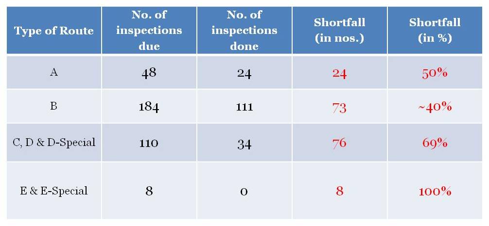 As can be seen from the above table, the scheduled inspections were left pending by anywhere between 40 & 100% for the review period. It is worth pointing out that pending inspection by track monitoring cars poses significant danger to safety of train movement.