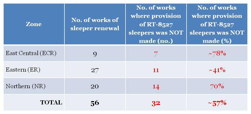 CAG Audit regarding use of RT-8527 sleepers in sanctioned patches of > 2 kms in length from 2019-20 onwards revealed following findings: