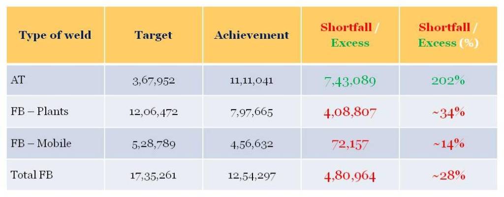 The Indian Railway Corporate Safety Plan of 2003-13 therefore emphasized on gradual reduction of AT welds and replacement by the more robust FB welds. Obviously, the FB welds are supposed to impart greater safety assurance to train movement. The CAG Audit naturally focuses on target achievement of FB welds. The results are below: