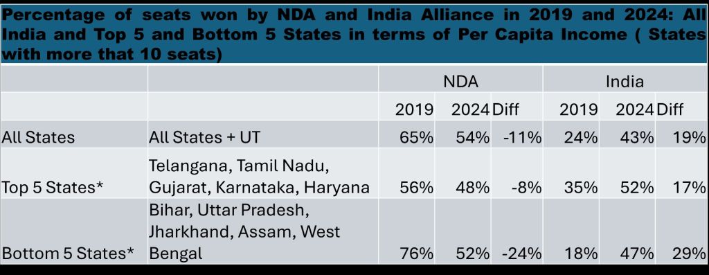 Similarly for the bottom 5 states it is clearly seen that the India alliance has gained more in this cohort ( 29 percent) than what they have gained in the all India level (19 percent). Thus the above table clearly shows that the GSDP per capita falls the decline in seats of NDA is severe and subsequently the increase in seats of India alliance is more. Hence the lower the per capita income of the state, higher is the loss of NDA and higher is the gain of India alliance in terms of seats as per the above table. It needs to be noted here though even after the severe loss, NDA still gets more than 50 percent of seats in the bottom 5 states cohort, but the gap between the two alliances reduces significantly.
