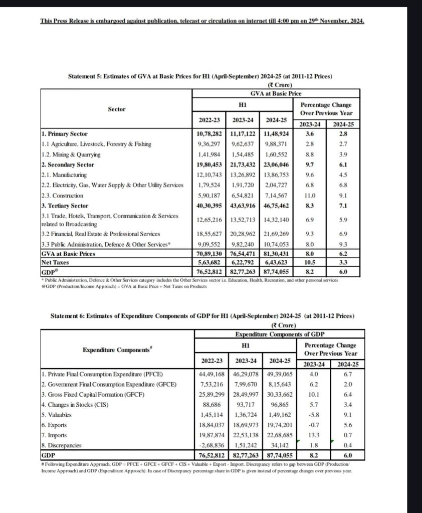 - Investment Momentum: Gross Fixed Capital Formation (GFCF) grew by 6.4%, slightly slower than 2023-24 but indicative of steady infrastructure and industrial investments at least in the urban sectors.