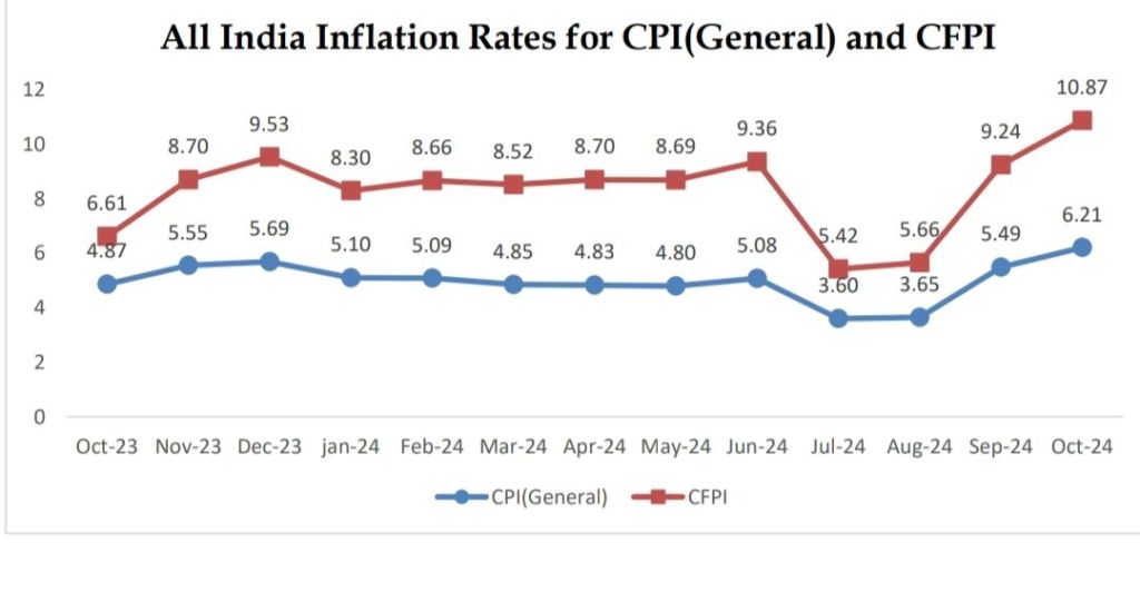 - CPI Trends: General inflation moderated to 6.21% in October 2024, up from 4.87% in October 2023, reflecting uncontrolled increase in broader price levels.