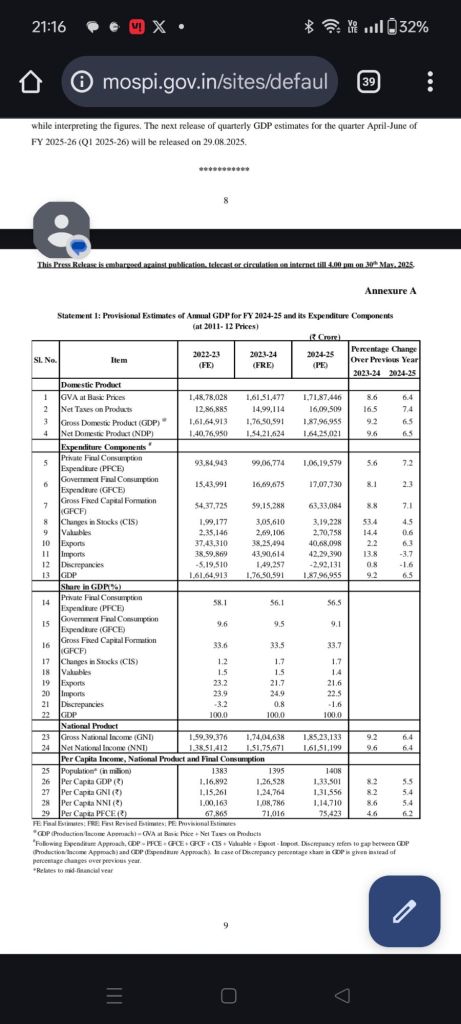 India’s economy expanded by 6.5% in FY 2024–25, down from 9.2% the previous year. While this growth rate remains one of the fastest globally, the moderation signals the end of the post-pandemic rebound and a transition into a phase where structural strengths and weaknesses will more clearly define the economic trajectory.